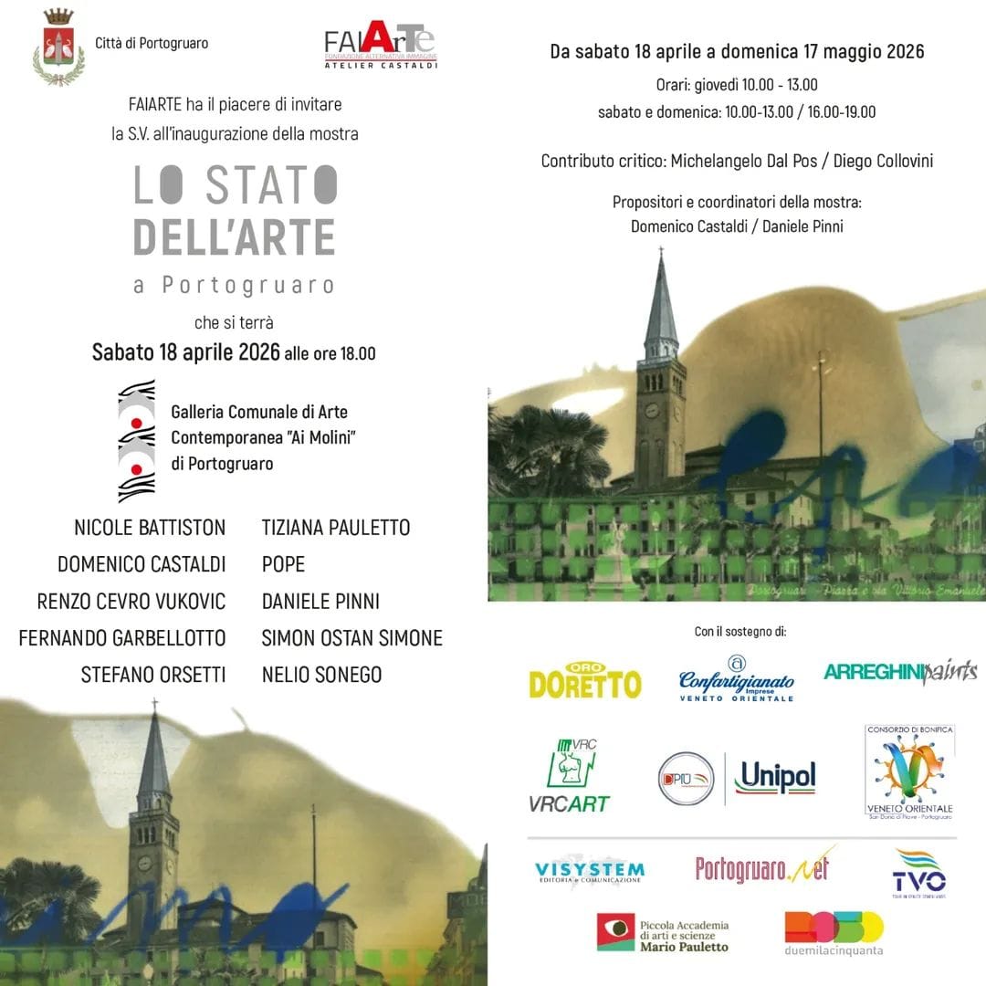 14 Aprile 2026Sarà inaugurata sabato 18 aprile 2026 alle ore 18.00, presso la Galleria d’Arte Contemporanea Ai Molini di Portogruaro, la mostra collettiva “Lo stato dell’arte a Portogruaro”, un progetto che propone uno sguardo aggiornato e articolato sulla produzione artistica del territorio. L’iniziativa riunisce dieci artisti, differenti per linguaggi ed esperienze ma accomunati da una ricerca autentica e contemporanea, tra cui Nicole Battiston, Domenico Castaldi, Renzo Cevrovukovic, Fernando Garbellotto, Stefano Orsetti, Tiziana Pauletto, Pope, Daniele Pinni, Simon Ostan Simone e Nelio Sonego.