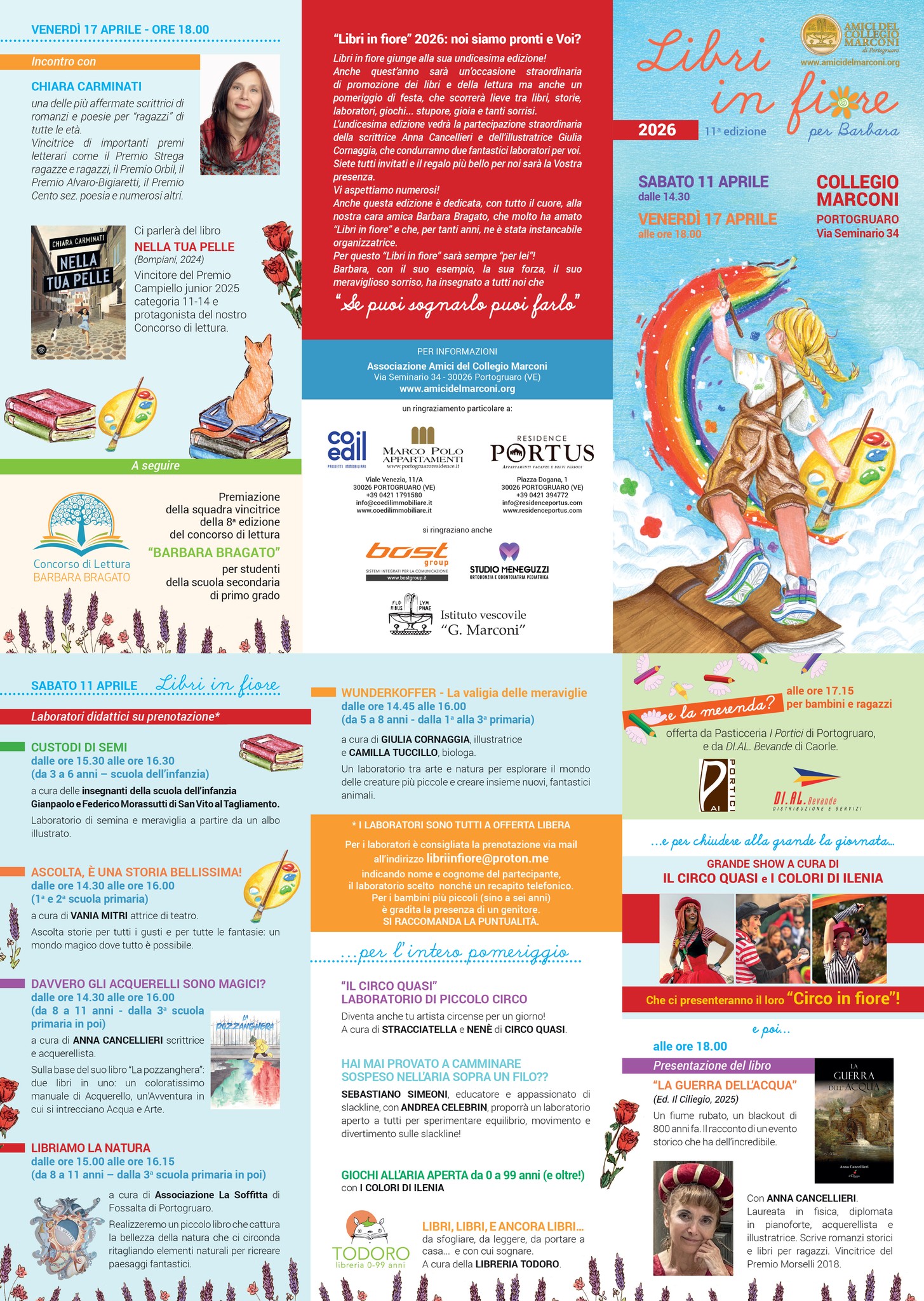 L’edizione 2026 rinnova inoltre il ricordo di Barbara Bragato, figura centrale nella nascita dell’iniziativa, a cui è dedicato anche il concorso di lettura per le scuole secondarie di primo grado, con premiazione il 17 aprile. Il programma si arricchisce infatti di un secondo appuntamento con la scrittrice Chiara Carminati, dedicato alla letteratura per ragazzi.